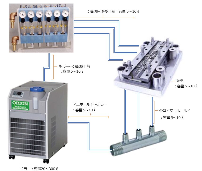 装置・配管・金型により異なりますが、通常は以下のような容量です。